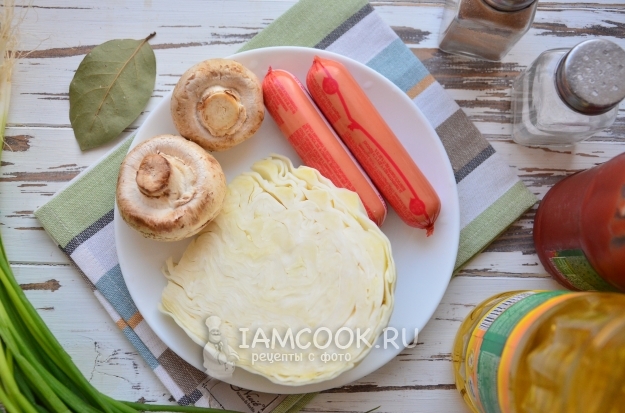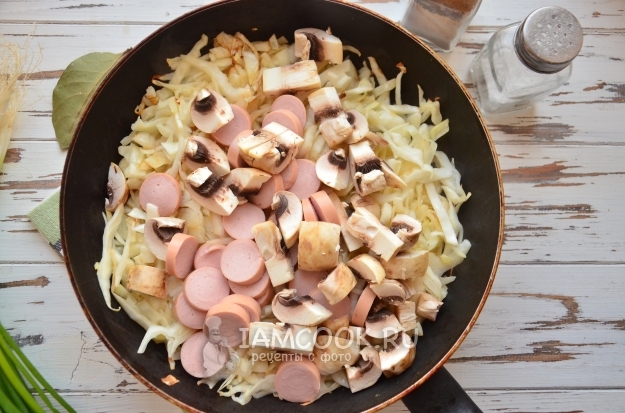 В нашем меню тушеная капуста с сосисками и грибами появляется довольно часто, и, кстати, не всегда в состав блюда входят именно шампиньоны. Иногда это вешенки, а иногда и лесные грибы. Правда, во втором случае продукт нужно почистить, тщательно промыть и проварить в течение получаса в подсоленной воде. В воду к грибам я бросаю еще и целую луковицу. Проваренные грибы затем уже можно жарить. Правда, стоит упомянуть, что в качестве таких грибов вы должны быть уверены.