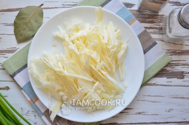 Белокочанную капусту помойте, после чего, вооружившись острым ножом, тонко ее нашинкуйте. Жесткую капусту можно слегка помять руками.