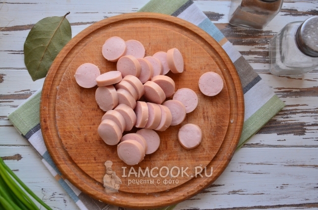 Сосиски, конечно же, выберите самые вкусные. Не стоит использовать сосиски с сыром - он вытечет на сковороду и может пригореть. А если вариантов нет, то такие сосиски лучше добавлять уже в самом конце приготовления. Почистите сосиски и нарежьте кружочками либо соломкой.