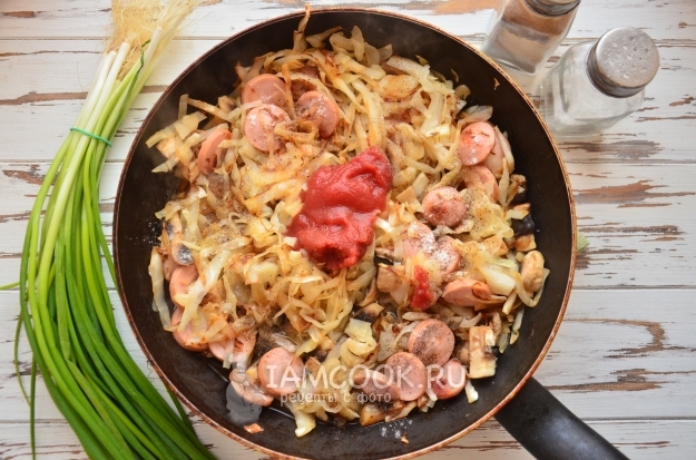 Добавьте в сковороду томатную пасту или томатное пюре. Влейте около 100 мл воды. Также посолите блюдо и добавьте специи по вкусу.