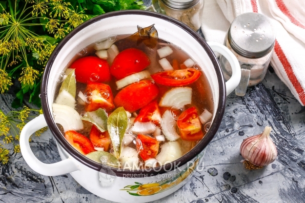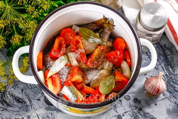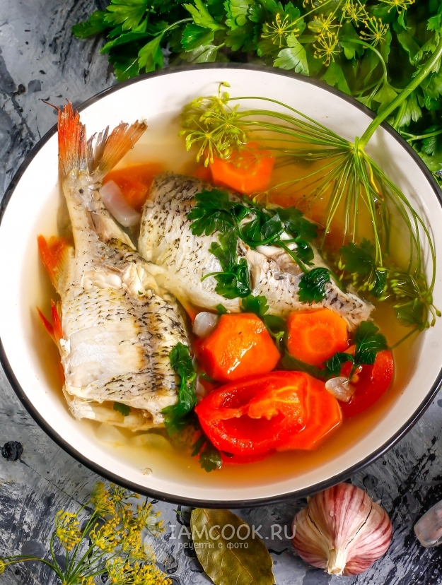Влейте воду и отварите в течение 25 минут на умеренном нагреве, не забыв снять образовавшуюся пену. Спустя указанное количество времени проверьте тушки рыбы на готовность.
