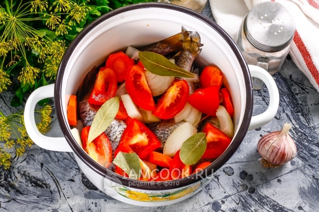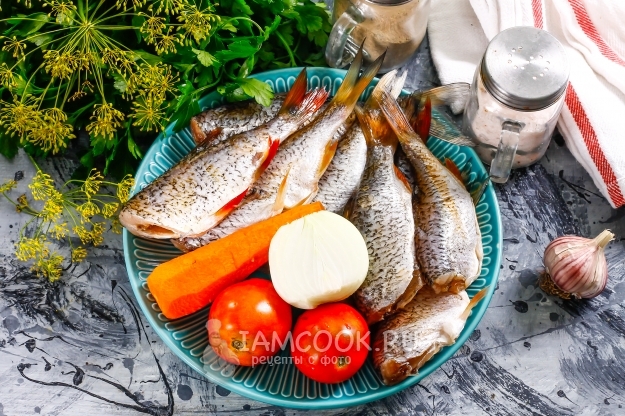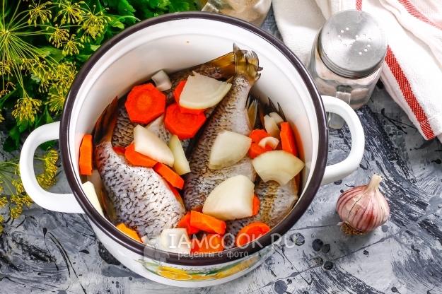 Рыбу очистите от чешуи, срежьте головы и удалите внутренности. Тщательно промойте тушки внутри и снаружи, выложите в кастрюлю или казан. Очистите от кожуры морковь и репчатый лук. Нарежьте крупно и добавьте в емкость к рыбе.