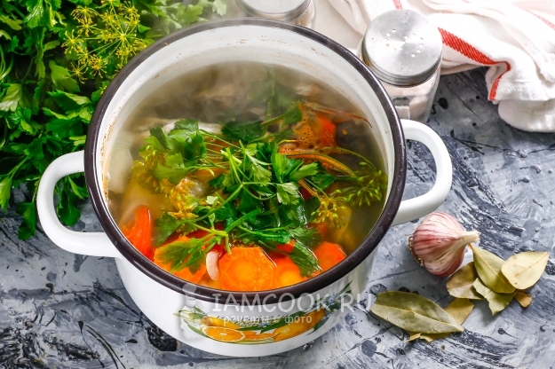 Очистите зубчики чеснока, промойте и спрессуйте в емкость. Промойте зелень петрушки или сельдерея, выложите в кастрюлю без нарезки. Протомите еще 2-3 минуты и выключите нагрев. Накройте емкость крышкой и дайте ухе настояться около 10 минут. Если блюдо готовится только для взрослых, то на это время выложите в бульон стручок горького перца или влейте 50 мл водки.