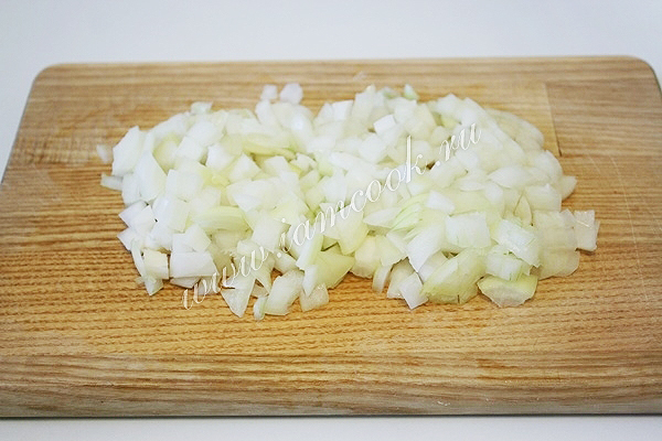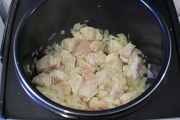 В чашу мультиварки положите кусочек сливочного масла. Включите программу «Жарка». Обжаривайте лук и кусочки куриного филе в течение 20 минут периодически перемешивая.