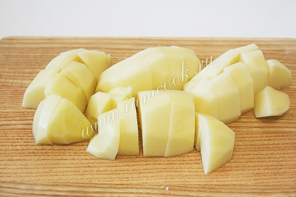 Пока курица с луком жарятся, начистите и помойте картофель. Нарежьте картофель некрупными кусочками.