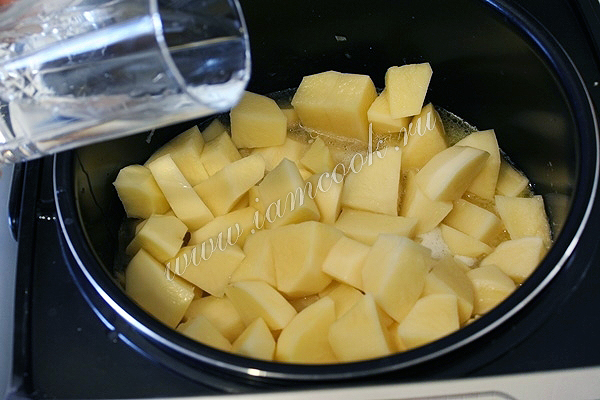 Сложите картофель сверху курицы, залейте водой. Вода должна почти покрывать картофель.