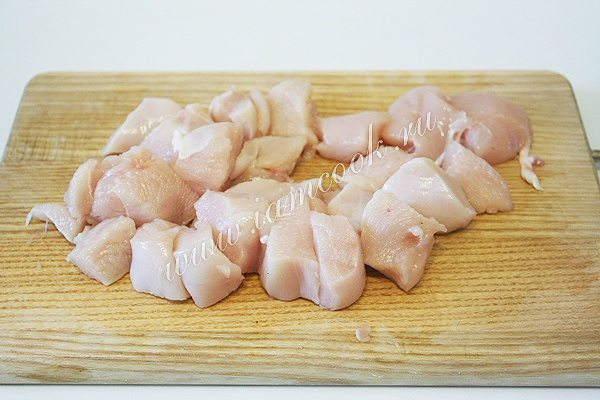 Куриное филе помойте и нарежьте не очень крупными кусочками.