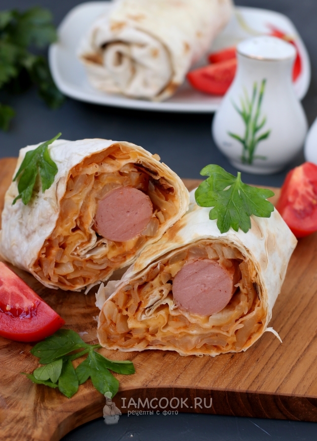Предлагаю вам приготовить сытную закуску в лаваше с сосиской и тушёной капустой. Такое блюдо можно вполне употреблять как самостоятельное, даже одной порции хватит, чтоб почувствовать себя сытым. Как вариант, можно приготовить вечером, а на следующий день взять с собой на работу и там подогреть, но даже в холодном виде закуска получается вкусной, а с горячим чаем или кофе - то что нужно!