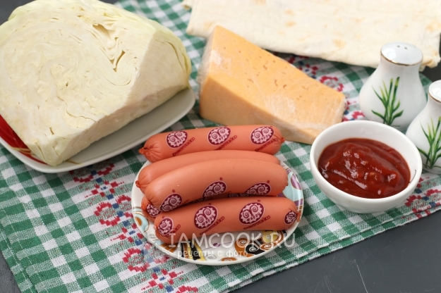 Для приготовления сосиски в лаваше с тушёной капустой и сыром подготовить из списка необходимые ингредиенты.