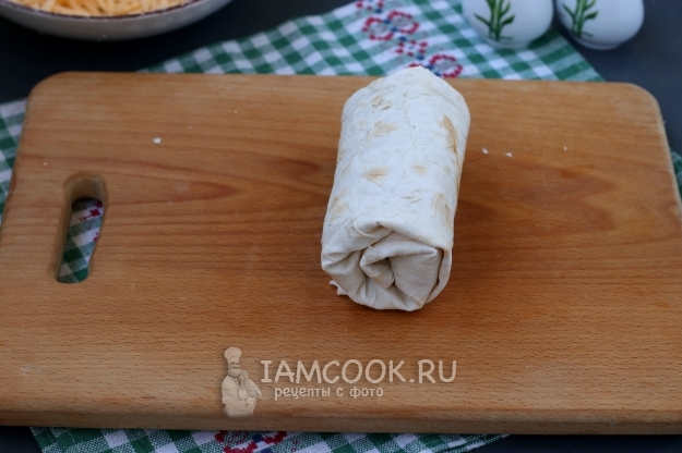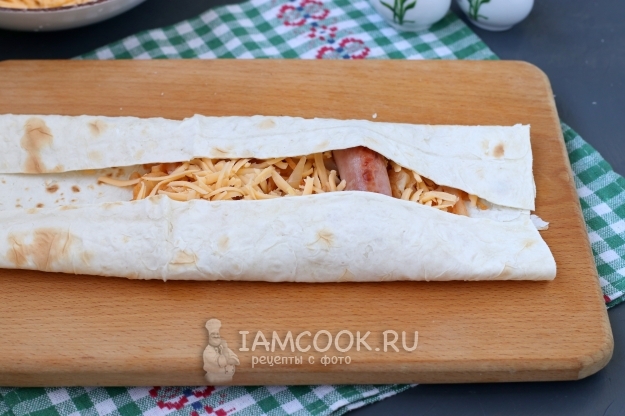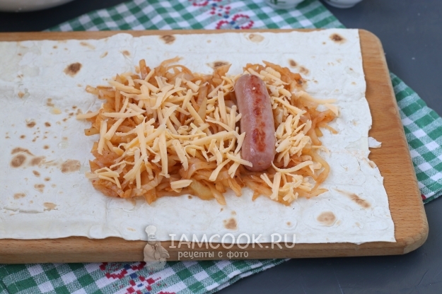 Лист лаваша разрезать на части так, чтобы можно было завернуть сосиску и капусту. Я разрезала каждый лист на две части, но поскольку лаваш бывает разной длины и ширины, исходите из того, что будет у вас. Сосиски можно предварительно сварить или немного обжарить до румяной корочки, так будет вкуснее. Разложить на лист лаваша небольшой слой капусты, сверху положить сосиску, посыпать натёртым сыром. Сыр нужен для того, чтобы скрепить начинку.