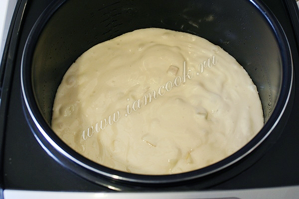 Чашу мультиварки смажьте сливочным маслом и обсыпьте панировочными сухарями. Тесто вылейте в чашу мультиварки.
