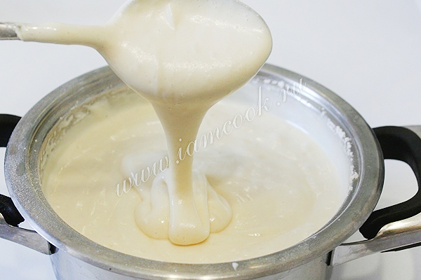 Добавьте ванилин и также в несколько приемов введите муку в яичную массу. Перемешивайте тесто ложкой движениями снизу вверх.