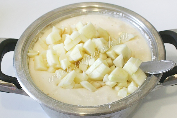Яблоки очистите от кожуры и нарежьте небольшими кусочками. Добавьте яблоки в тесто и перемешайте так, чтобы все яблоки были покрыты тестом.