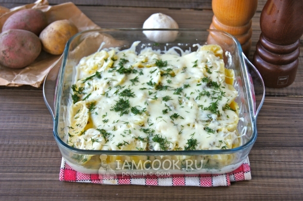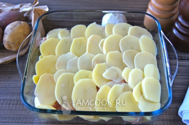 Для начала вымойте картофель, очистите и нарежьте на тонкие слайсы, разделите на 2 части, выложите одну часть в форму для микроволновой печи.