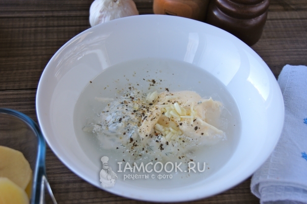В миску налейте воду, добавьте сметану (у меня - сметана с укропом), майонез, тертый чеснок, соль, перец, приправу и перемешайте.