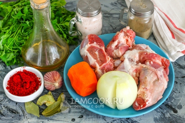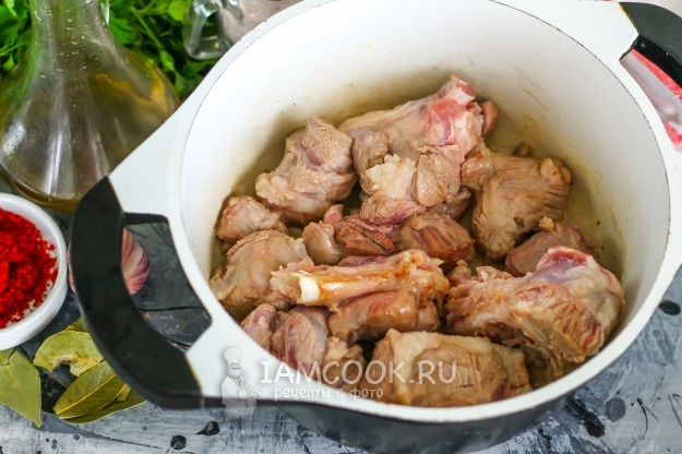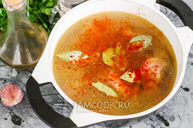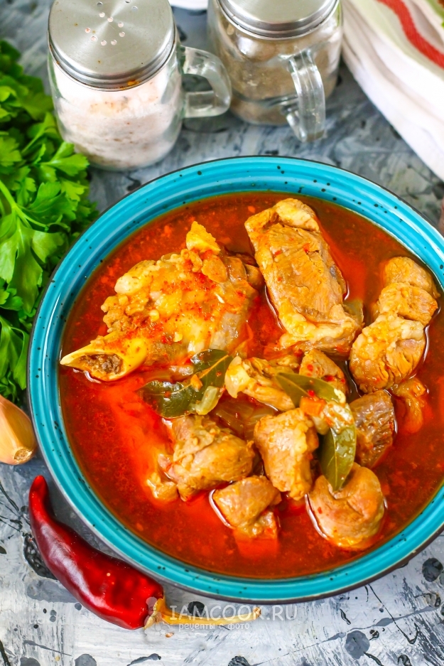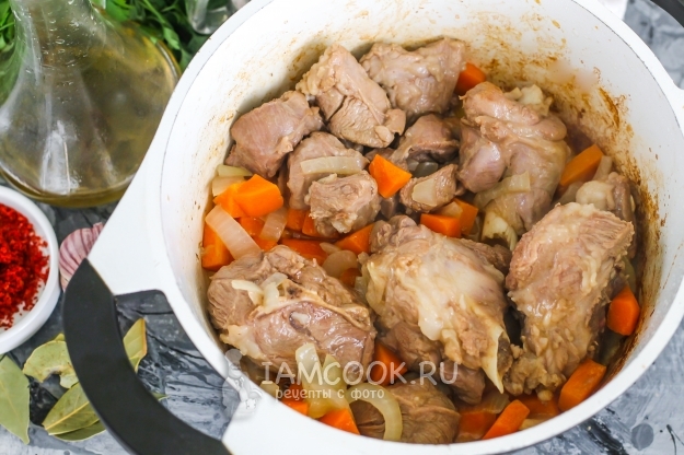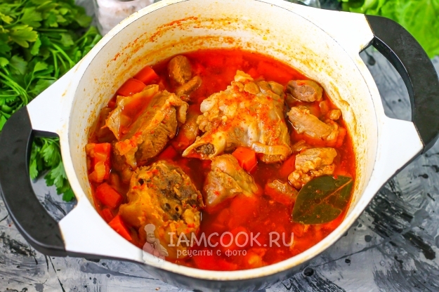 После этого влейте воду, всыпьте лавровые листья, соль и молотый черный перец, молотую паприку и горький перец. Доведите жидкость до кипения, затем снимите образовавшуюся пену. Убавьте нагрев до минимума, прикройте емкость крышкой и томите блюдо в течение 2 часов, не подливая воду.