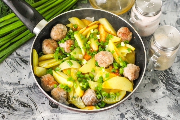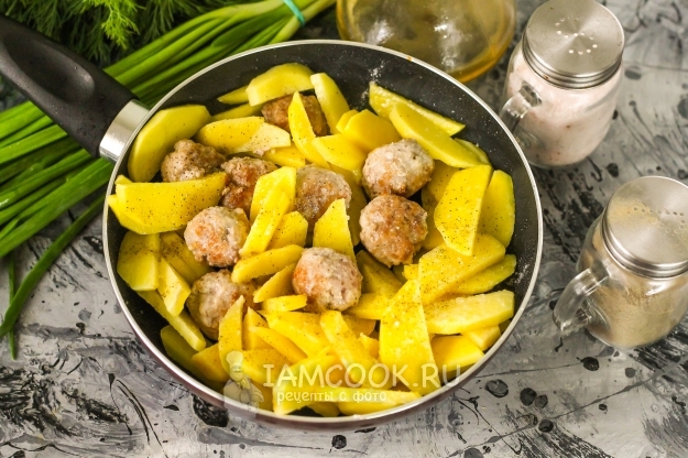 Нарежьте картофельные клубни и всыпьте нарезку в сковороду, приподнимая фрикадельки со дна. Присолите нарезку и поперчите. Накройте емкость крышкой и обжарьте блюдо на умеренном нагреве, время от времени перемешивая.