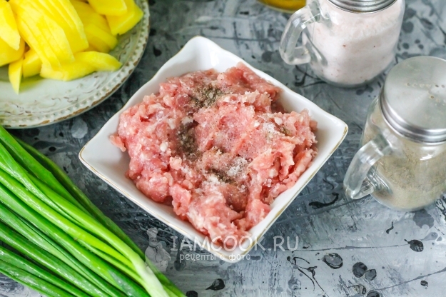 Мясной фарш посолите и поперчите, добавьте в него белок куриного яйца и тщательно все перемешайте. Картофель очистите от кожуры, промойте в воде.