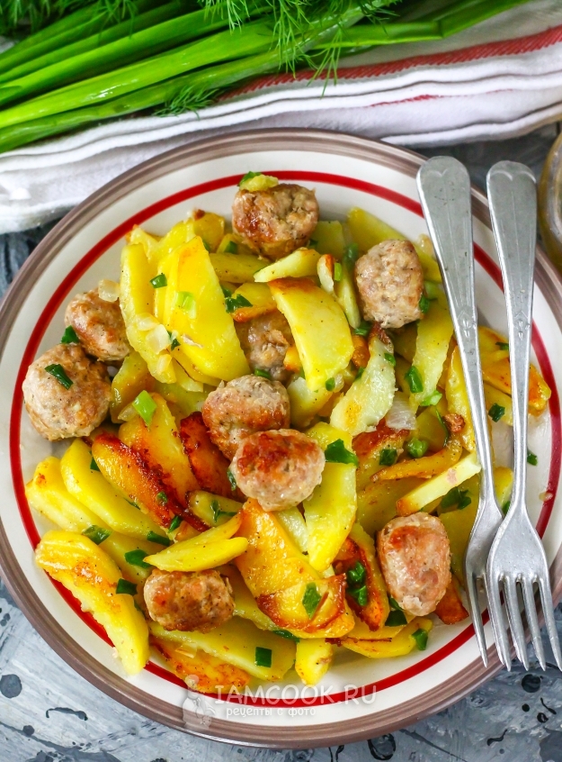 Выложите жареный картофель с фрикадельками в тарелки и подайте к столу горячим.