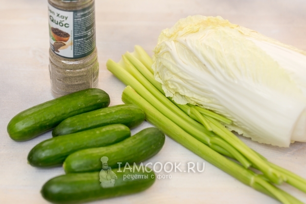 Для приготовления салата из свежих огурцов с пекинской капустой подготовьте продукты по списку.