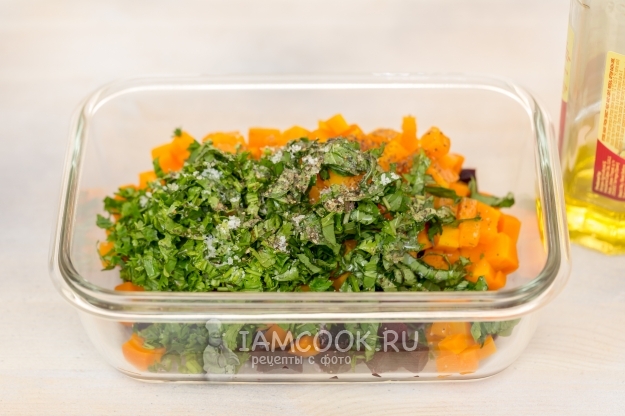 Добавьте нарезанные кинзу и базилик. Приправьте солью и перцем, добавьте масло.