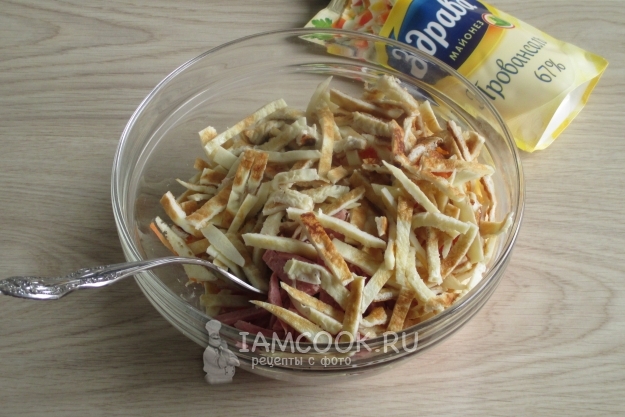 Перед подачей заправьте майонезом по вкусу и перемешайте. По желанию и по вкусу посыпьте молотым черным (или другим) перцем.