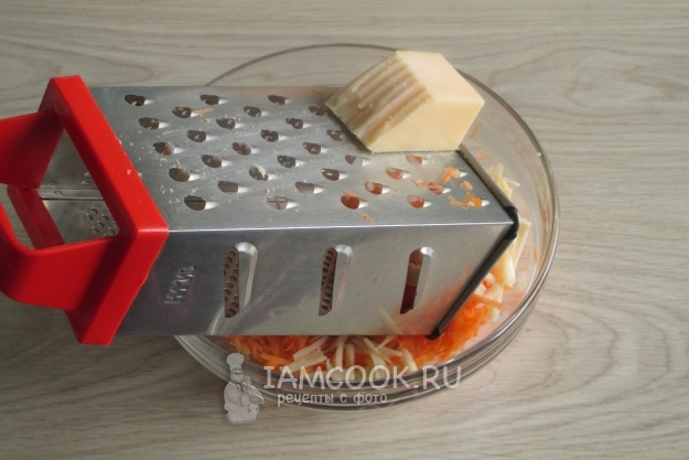 Так же натрите любой сыр полутвердых сортов (Обской, Гауда, Голландский, Пошехонский, Российский и т.п.). Добавьте раздавленный или мелко рубленный чеснок.