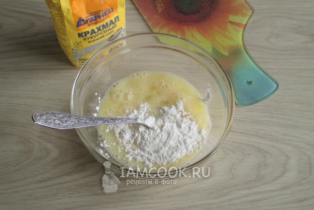 Для яичных блинчиков перемешайте яйца с крахмалом и слегка посолите.