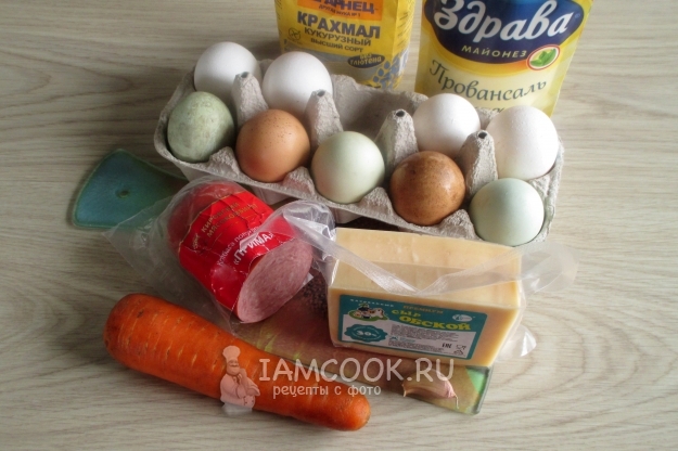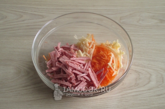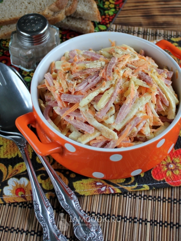 Салат «Шустрый Петя» с яичными блинчиками, сырой морковью, колбасой и сыром - очень сытный, для многих заманчиво аппетитный и будет в тему даже на праздничном столе или на семейном застолье.