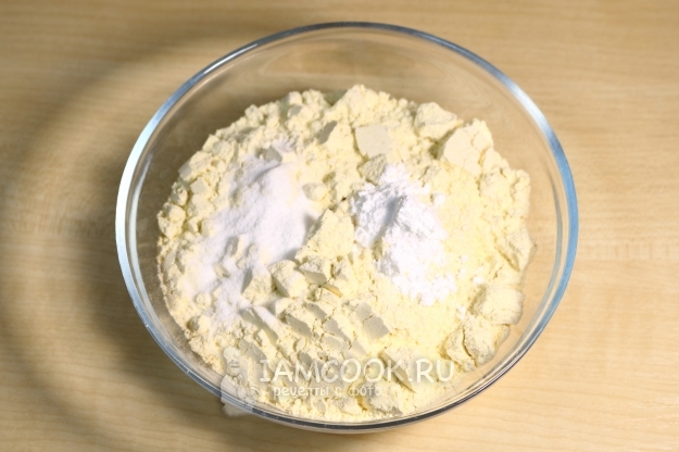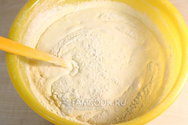 Отдельно соединяем сухие компоненты: кукурузную муку, ванилин и разрыхлитель. Перемешиваем до однородности.