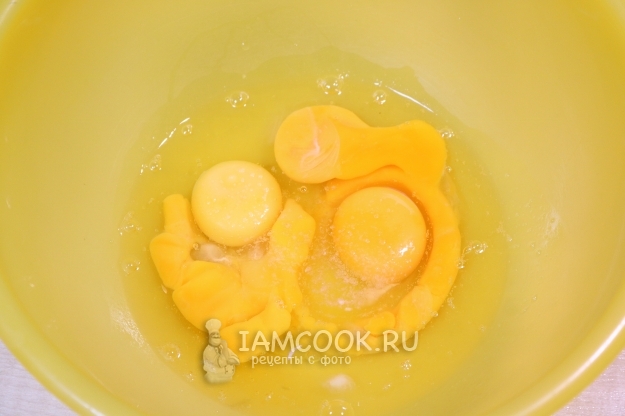 В миску разбиваем яйца и всыпаем щепотку соли. Я использую яйца первой категории – они небольшие, отборных можете взять четыре штуки.