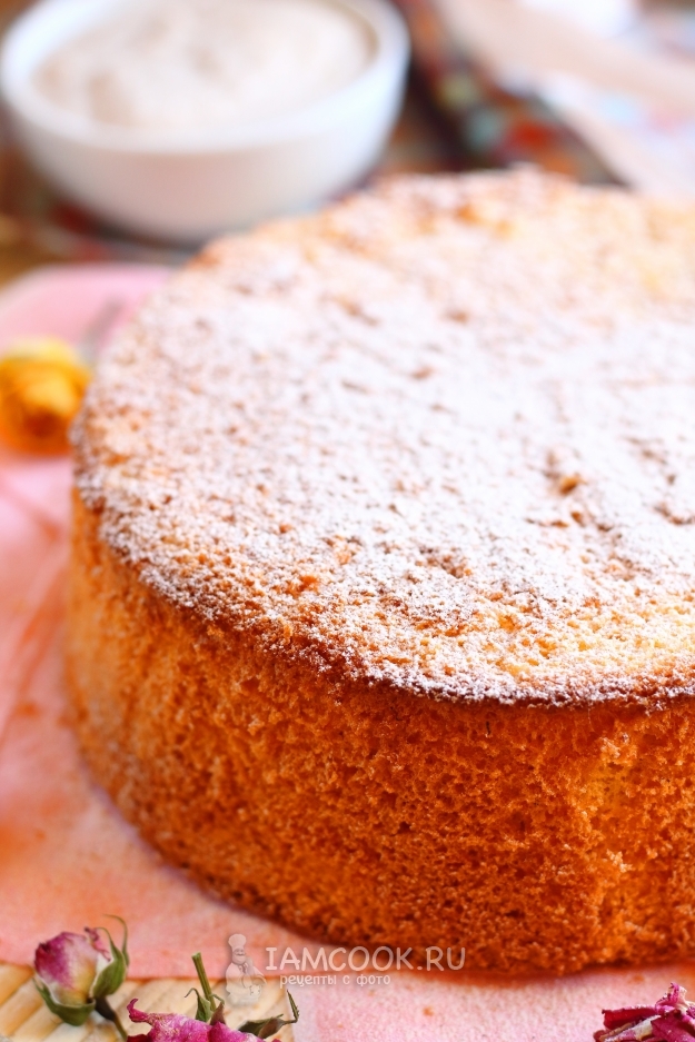 Кукурузный бисквит готов! Приукрасьте его сахарной пудрой и подавайте к столу. Либо разрежьте на 2-3 коржа, пропитайте сиропом и промажьте любимым кремом. Получите отличный тортик.