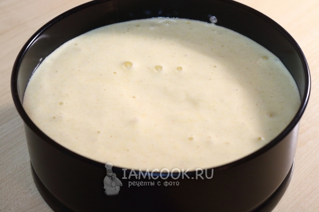 Перекладываем массу в разъёмную форму, промазанную тонким слоем масла. Ставим в духовку, разогретую до 180 градусов, на 35-45 минут. Время зависит от вашей духовой печи. Первые полчаса старайтесь не открывать духовку, а следить за бисквитом из окошечка. Такая выпечка не любит резких перепадов температуры.