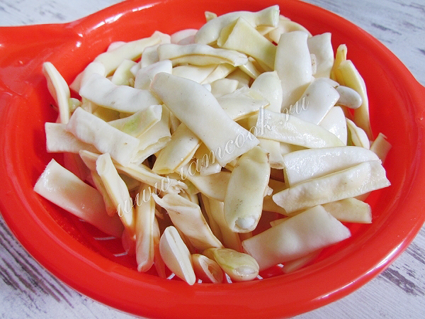 Фасоль хорошо промойте под холодной водой, срежьте хвостики и разрежьте крупные стручки на 2-3 части.