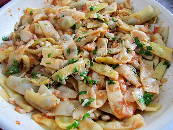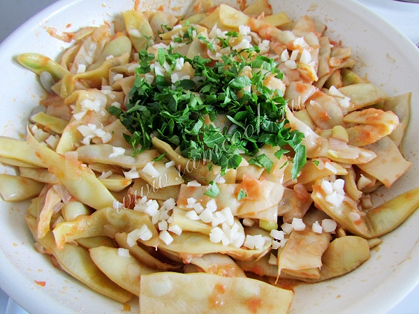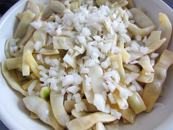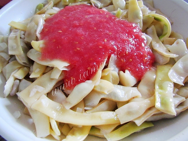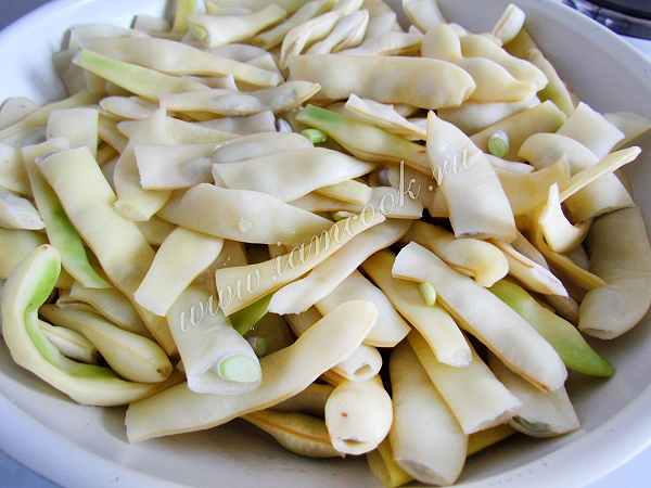 Это блюдо родом с Кубани, где в сезон желтой стручковой фасоли его готовят во многих домах. Использовать лучше молодые стручки фасоли, перезрелые будут жесткими. Для остроты и пикантного вкуса в блюдо можно добавить чеснок, зелень кинзы и специи. Если не любите кинзу, замените ее петрушкой. Подавать блюдо можно как в горячем, так и в холодном виде - оба варианта вкусны.