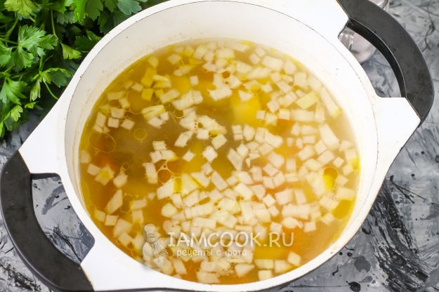 Очистите от кожуры картофель, морковь и лук, промойте овощи в воде. Нарежьте картофель средними кубиками, морковь и лук - мелкими. Добавьте все нарезки в бульон, всыпьте соль. Отварите в течение 15 минут.