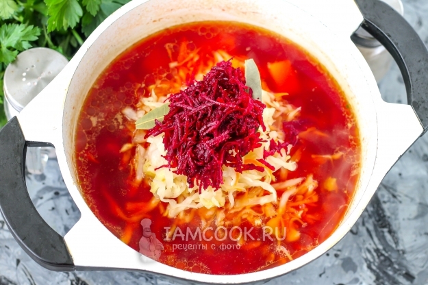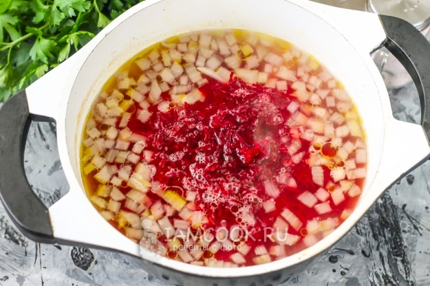 Очистите свеклу от кожуры, промойте и натрите на терке с мелкими ячейками. Часть натертой массы отложите - ее добавите за 5 минут до готовности блюда, чтобы борщ не потерял свой цвет. Выложите свекольную массу в кастрюлю и отварите около 10 минут.