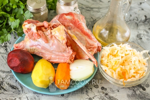 Для создания блюда можно использовать любую часть утиной тушки, но я определила для него каркас, шею и заднюю часть, чтобы борщ не получился слишком жирным. Утиное мясо нужно варить не менее 1,5 часов, чтобы оно стало мягким, поэтому сам борщ будет готов за 2 часа.