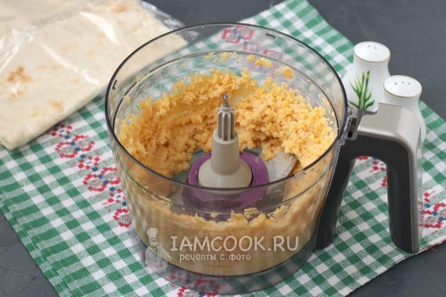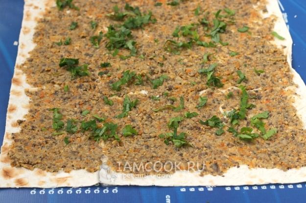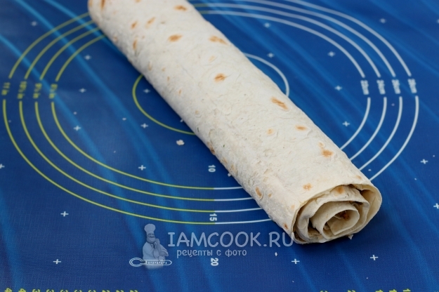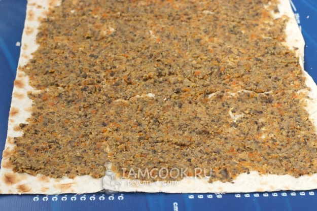 Накрыть вторым листом лаваша, смазать его остатком начинки и плотно скрутить в рулет.