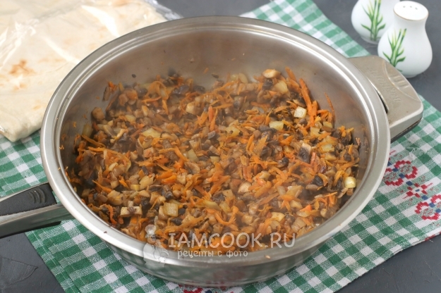 В сковороде разогреть растительное масло, обжарить немного лук с морковью, затем добавить грибы и готовить до выпаривания жидкости. Всё содержимое посолить и поперчить, добавить молотый кориандр. Снять сковороду с огня и немного остудить овощи с грибами.