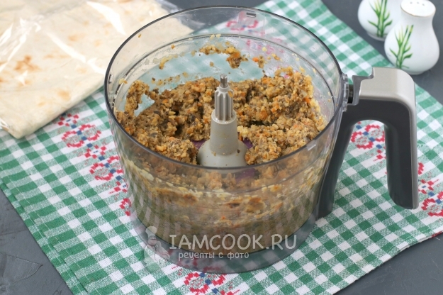 Затем всё переложить в чашу комбайна и измельчить вместе с нутовым пюре. Если начинка покажется вам слишком густой, её можно разбавить нутовым отваром, который мы сохранили после варки.