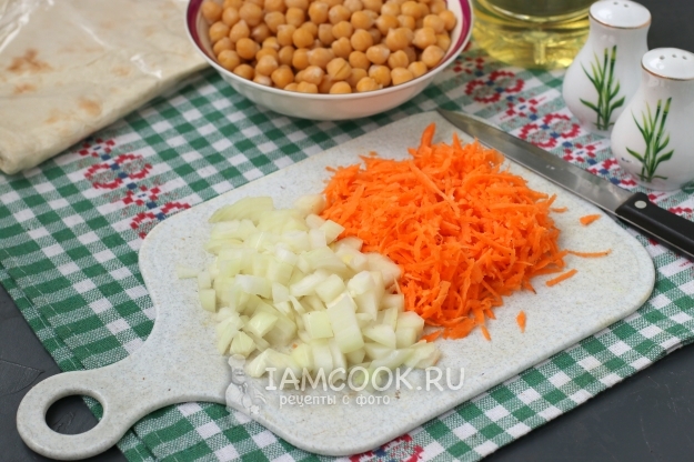 Натереть на тёрке морковь, лук измельчить кубиками.
