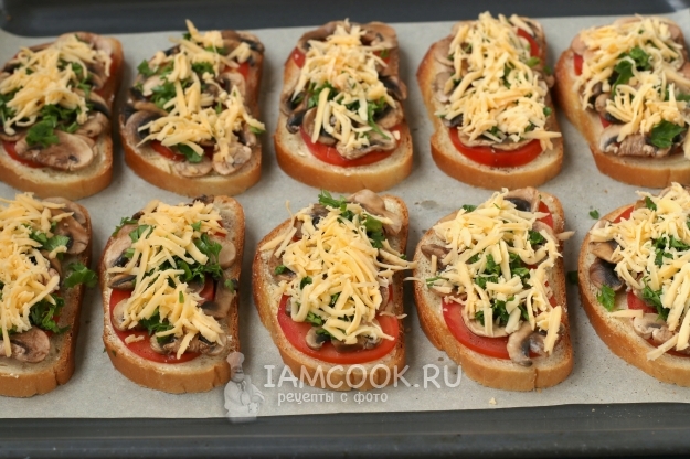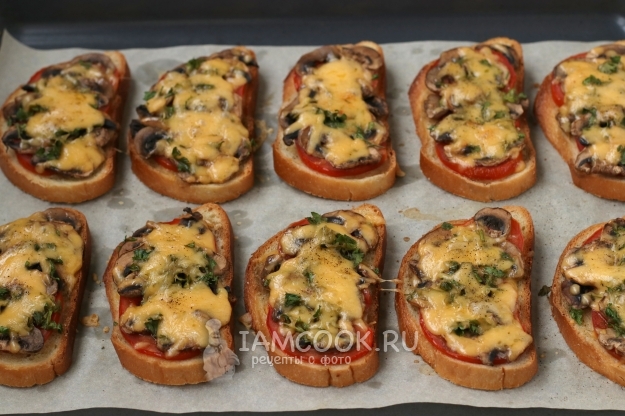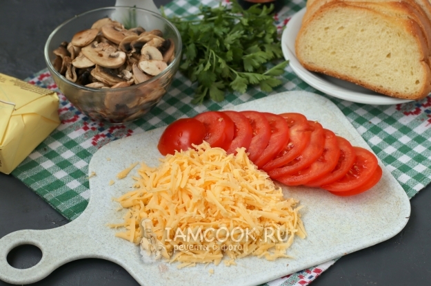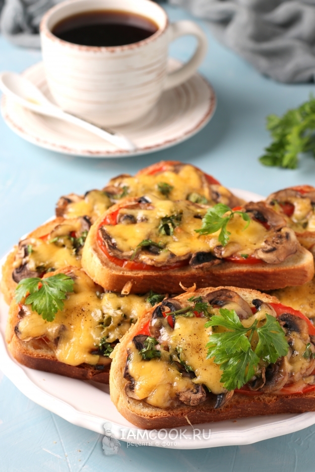 Горячие бутерброды с грибами и помидорами сразу же подать к столу. Украсить можно по желанию листочками петрушки.