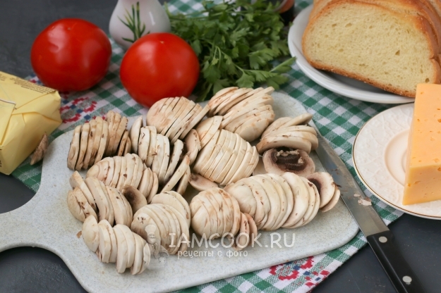 Шампиньоны промыть, удалить ножки (их можно использовать в другое блюдо). Нарезать шампиньоны тонкими пластинками.