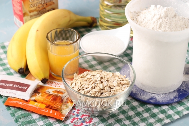 Для приготовления овсяных кексов с бананом подготовить из списка необходимые ингредиенты.