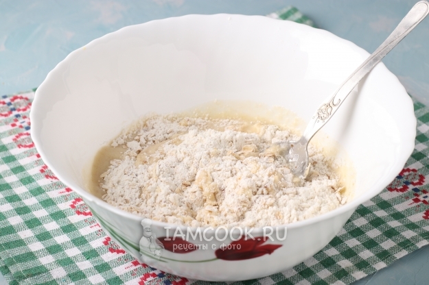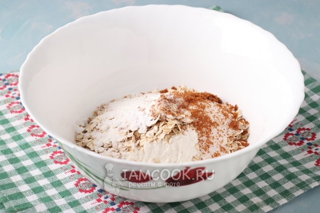 В глубокую миску просеять муку с содой и разрыхлителем, добавить соль, сахар, овсяные хлопья и коричневый сахар. Всё тщательно перемешать.