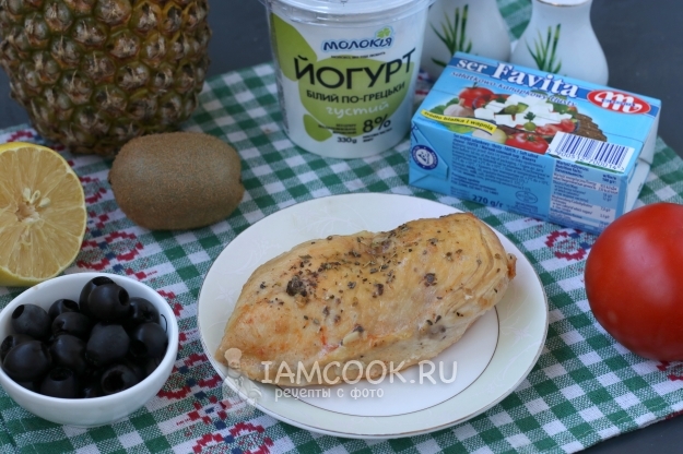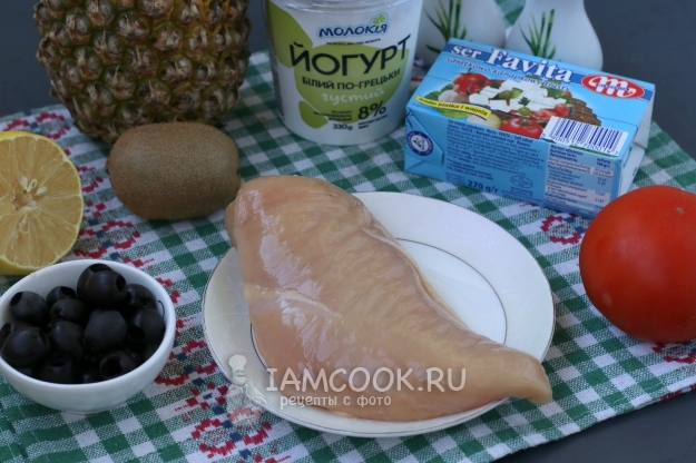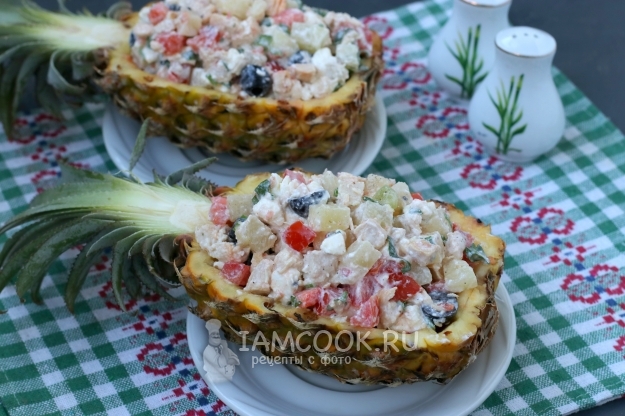 Хочу предложить вам красивый и эффектный салат в половинках ананаса, который можно подать для романтического ужина. Были времена, когда я устраивала своему супругу романтические ужины и готовила порционные салаты, в том числе и в ананасе. В этот раз мы посвятили наш ужин возвращению из отпуска и салат с курицей в ананасе прекрасно вписался в эту атмосферу. Совсем недавно я предлагала рецепт куриного филе в лимонном соусе, и для этого салата я решила использовать именно его. По желанию можно филе просто запечь в духовке обычным способом или на крайний случай просто отварить.