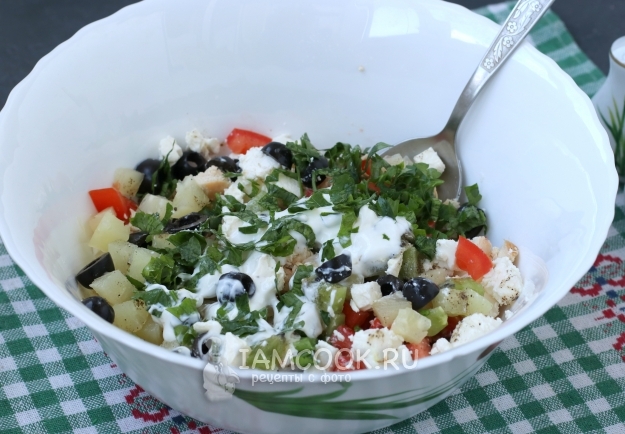 Добавить в салат чайную ложку лимонного сока, йогурт и измельчённую петрушку.