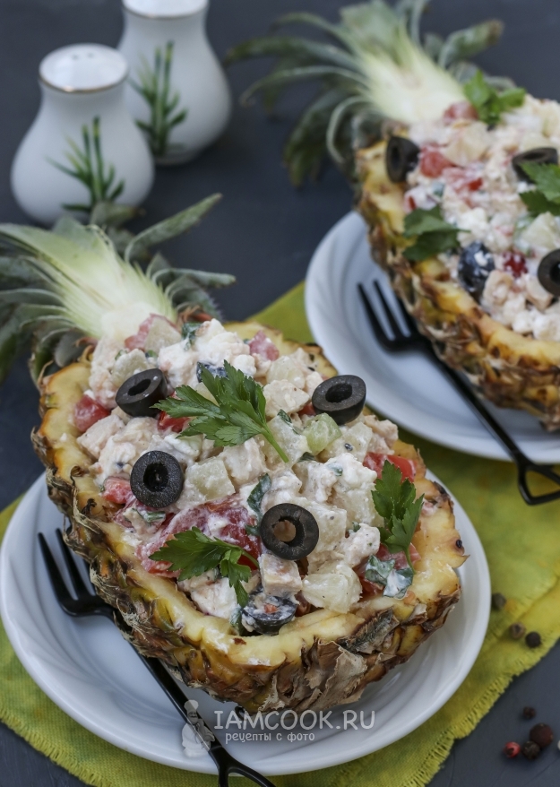 Салат с курицей в ананасе готов. Подать к столу, украсив сверху листочками петрушки и колечками маслин.