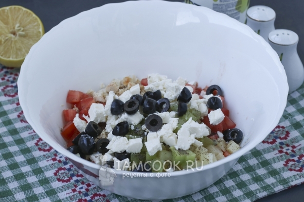 В салат нарезать сыр фета и кружочками маслины, посолить и поперчить.